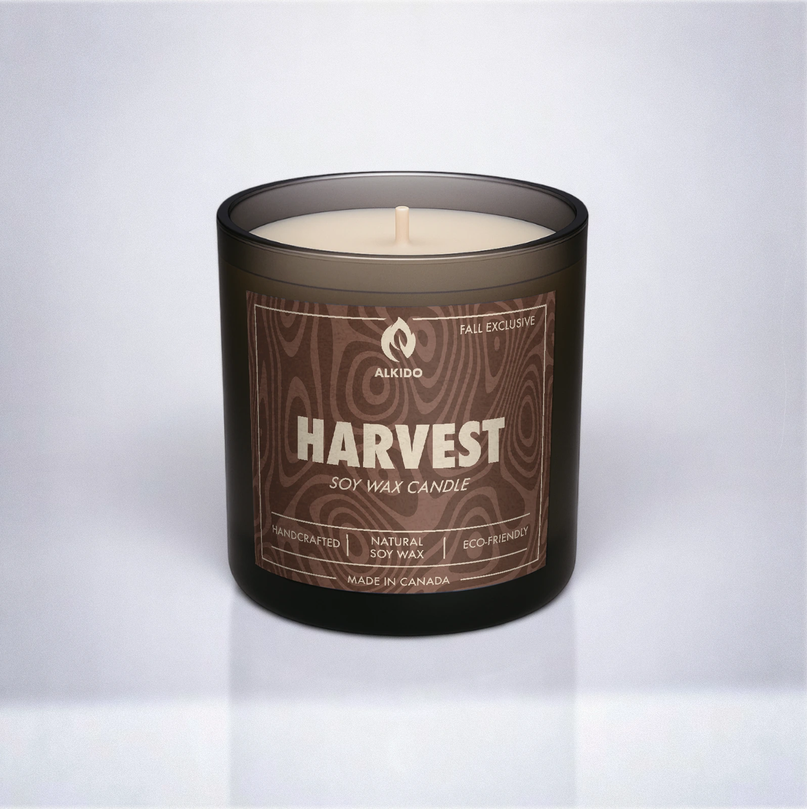 ALKIDO HARVEST – Cinnamon Soy Wax Candle – Fall Exclusive. Harvest is spice and fire bound in flame. Warm, rich, unapologetically bold. Its scent burns like autumn itself — earthy, spiced, and lasting. Eco-friendly. Made in Canada. Strength, warmth, balance. Rest in comfort. Burn in power. Only this fall.